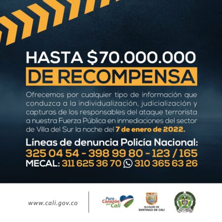 The city of Cali announced a reward of up to $70 million Colombian Pesos (approximately $17.400 USD) for information leading to the identification, capture, and prosecution of those responsible.