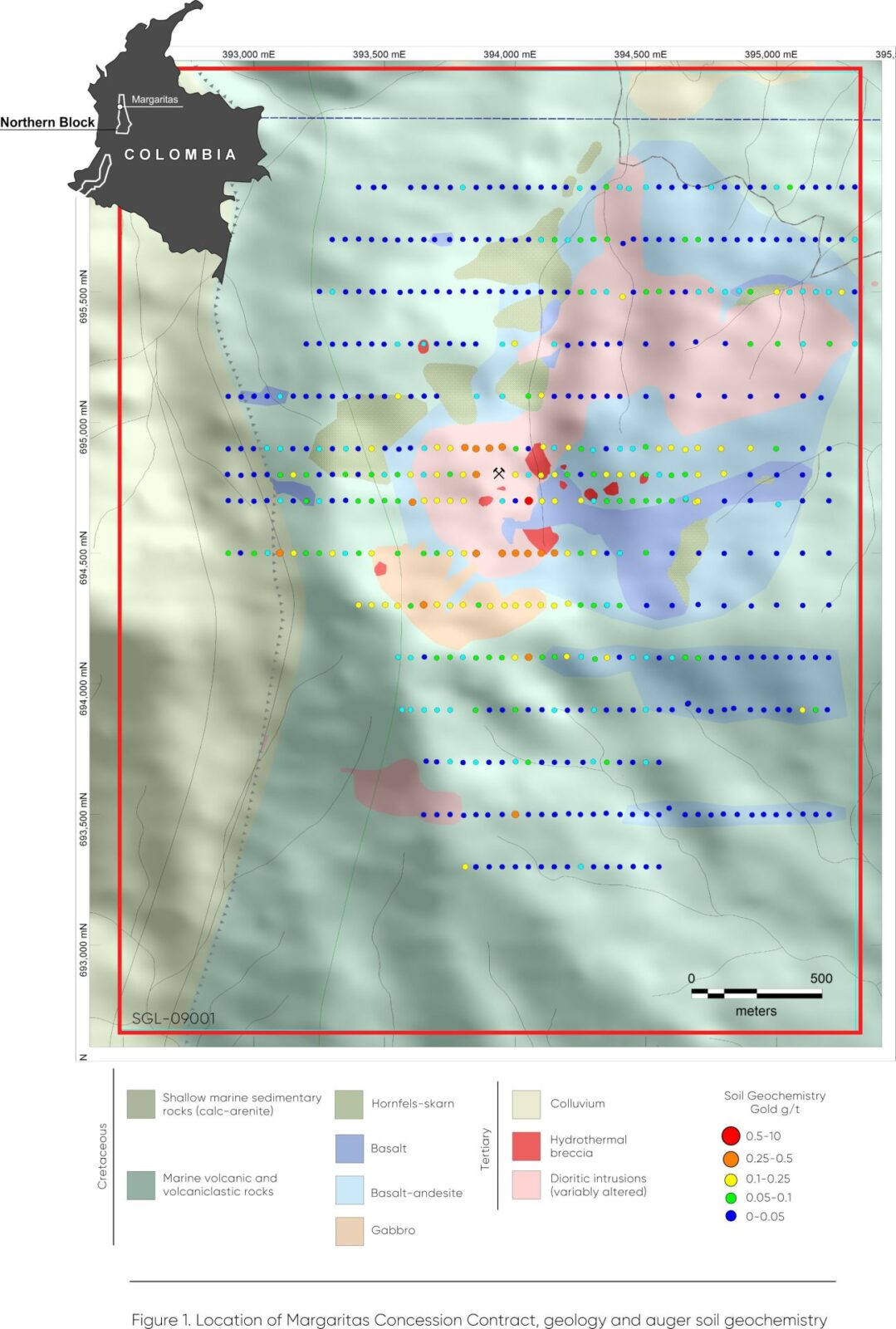 From 2012 to 2017, AngloGold Ashanti completed geological mapping, reconnaissance rock-chip sampling, ridge and spur soil sampling and an airborne magnetic and radiometric survey over the Margaritas area. Royal Road has conducted grid-based surface geochemical sampling and further geological mapping at Margaritas, as indicated in the below figure. The company now considers the project “drill-ready”, subject to the fulfilment of the Social Management Plan, environmental baseline studies and the receipt of all necessary permissions.