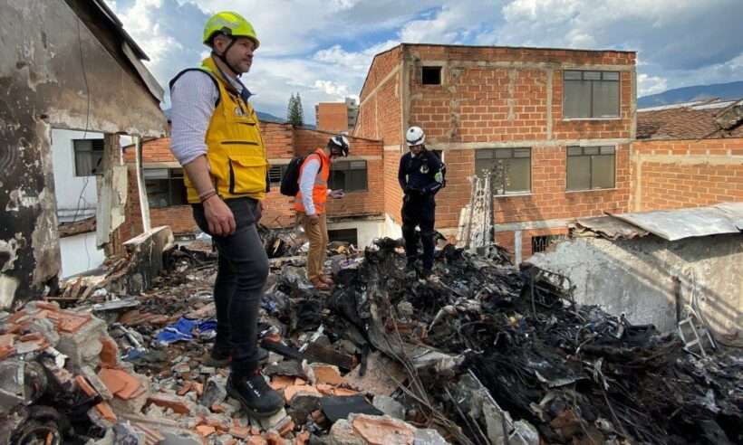 Above photo: Colombian authorities inspect damage in Medellín’s Belen neighborhood after the crash. (Photo: DAGRD)