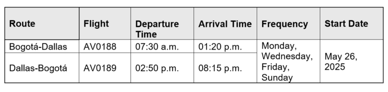 Avianca has announced the launch of a new direct route between Bogotá and Dallas, scheduled to commence on May 26, 2025. The airline plans to operate four weekly flights on this route, utilizing Airbus A320 aircraft, each with a capacity of 180 passengers, totaling 1,440 seats per week.