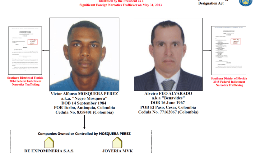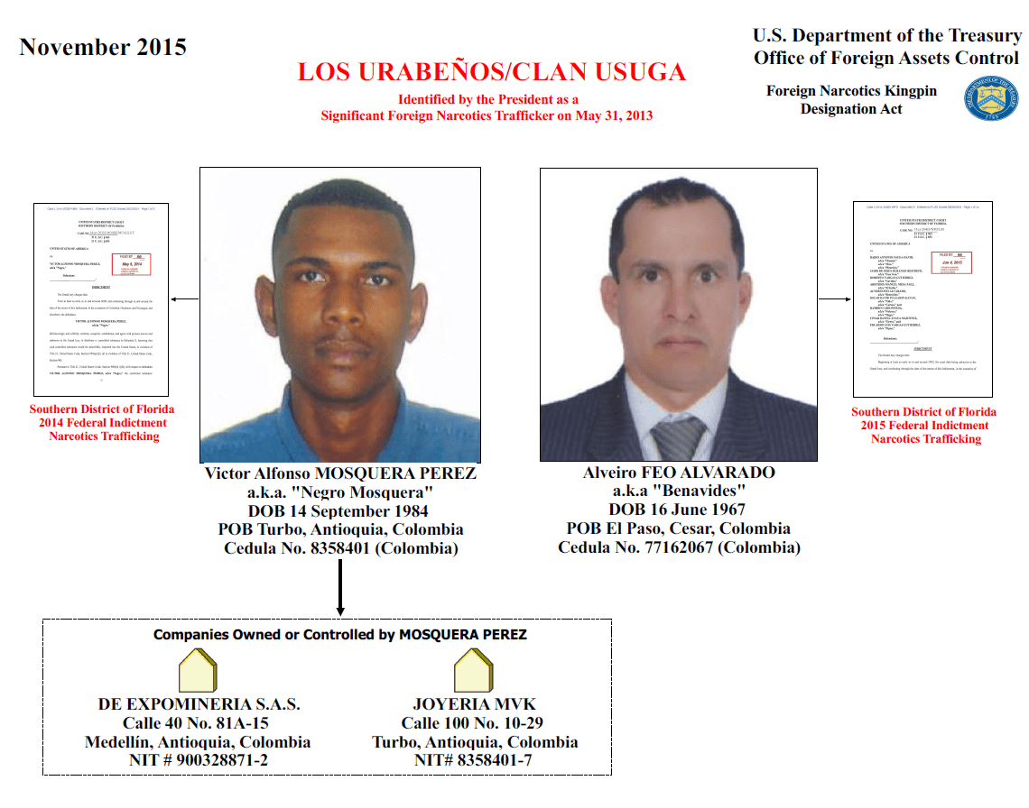 ![The following individuals have been added to OFAC's SDN List: FEO ALVARADO, Alveiro (a.k.a. "BENAVIDES"), Colombia; DOB 16 Jun 1967; POB El Paso, Cesar, Colombia; citizen Colombia; Cedula No. 77162067 (Colombia) (individual) [SDNTK] (Linked To: LOS URABENOS). MOSQUERA PEREZ, Victor Alfonso (a.k.a. "NEGRO MOSQUERA"), Colombia; DOB 14 Sep 1984; POB Turbo, Antioquia, Colombia; citizen Colombia; Cedula No. 8358401 (individual) [SDNTK] (Linked To: LOS URABENOS). The following entities have been added to OFAC's SDN List: DE EXPOMINERIA S.A.S. (a.k.a. DE EXPOMINERIA S.A.), Calle 40, 81 a 15, Medellin, Colombia; NIT # 900328871-2 (Colombia) [SDNTK]. JOYERIA MVK, Calle 100 # 10-29, Turbo, Antioquia, Colombia; NIT # 8358401-7 (Colombia) [SDNTK].](https://www.financecolombia.com/storage/2015/11/Clan-Usuaga.png)