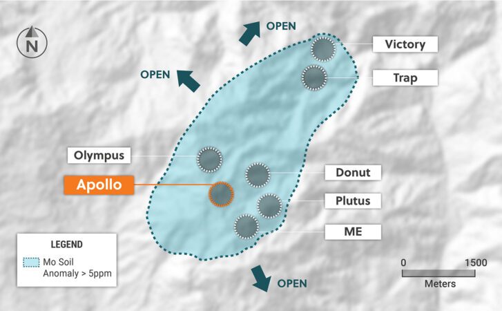 - Hole APC-48 was drilled to the southwest from Pad 7 and successfully expanded the overall footprint of the shallow mineralization to the southwest. Interestingly, the hole exited the brecciated portion of the Apollo porphyry system and continued to the end of the interval in a mineralized precursor porphyry unit.
