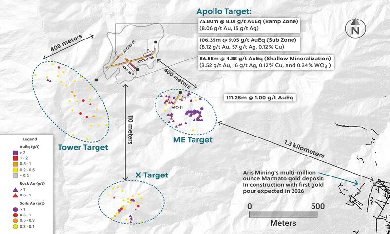 • One rig is being mobilized to the ME target, situated midway between the Apollo system and Aris Mining Corporation’s Marmato mine to the southeast. Five shallow holes drilled in 2023 at the ME target intersected a precious metal-rich breccia system, with APC-81 intersecting 111.25 meters at 1.00 g/t AuEq. A recent reinterpretation suggests a potential for Ramp Zone-style mineralization (gold-silver-bismuth-tellurium) at deeper elevations within the ME target. Drilling is expected to commence towards the end of April 2025, with initial assay results anticipated in early Q3 2025.
