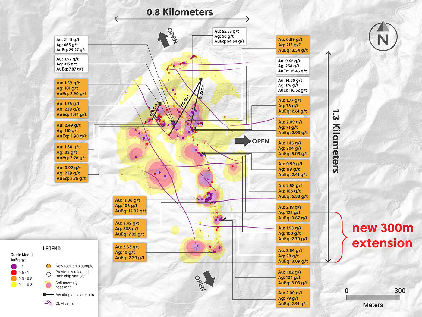 - In the south, two new outcrop areas of brecciated porphyry with overprinting CBM veins have been identified and host the same type of consistent high-grade gold and silver mineralization as the north zone with values up to 12.02 g/t gold equivalent (11.06 g/t gold, 106 g/t silver and 0.02% copper). See Table 1 for further details.