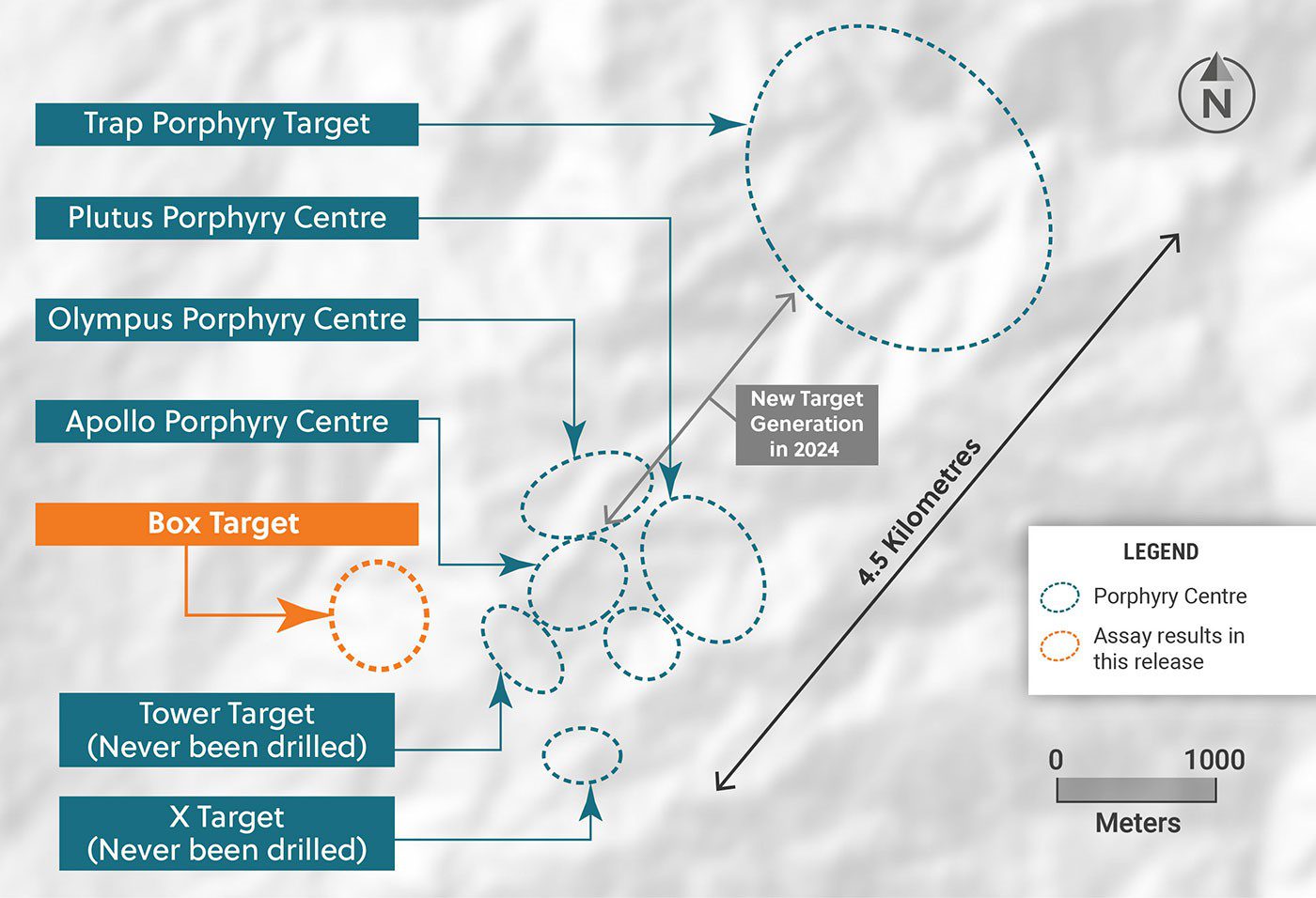 - Further surface exploration work at Box has discovered new well mineralized, brecciated porphyry outcrops resulting in an expansion of the target area by 300 metres to the south. The Box target area now measures approximately 1.3 kilometers by 0.8 kilometers by 0.4 kilometers vertically and remains open in all directions and at depth (see Figure 1).