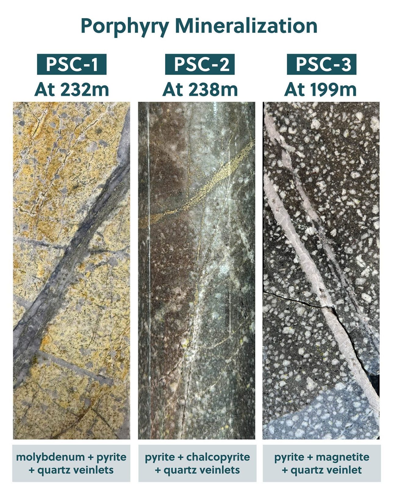 - PSC-3: 275.05 meters at 0.30 g/t AuEq from 33.95 meters, including 20.50 meters at 0.57 g/t AuEq from 40.85 meters