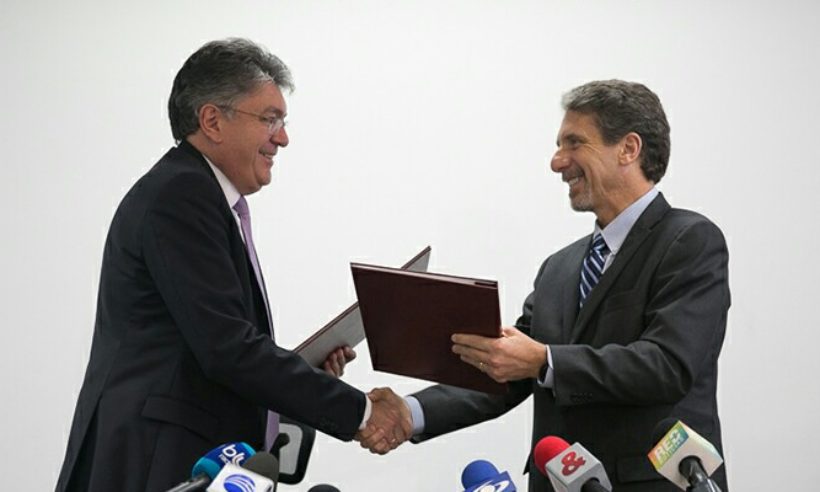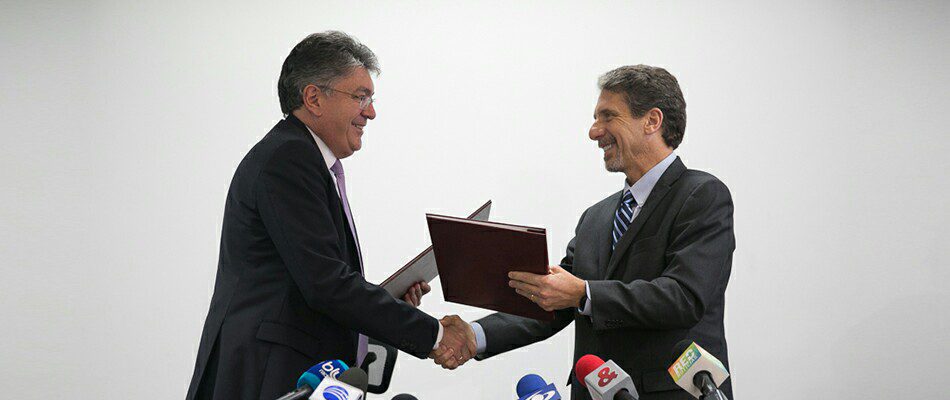 Above: Colombian finance minister Mauricio Cardenas exchanges documents with US Ambassador Kevin Whitaker. (photo credit: Emilio Aparicio – MHCP)