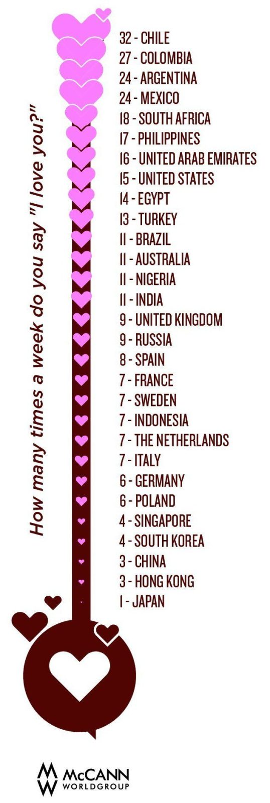 The Japanese are at the other end of the spectrum, rationing those three little words to once a week.  Similarly, in neighboring China and Hong Kong 3 times is the norm, while for South Korea and Singapore 4 times is typical.  This isn’t to say, of course, that these cultures are any less loving than the people of other countries, rather that some cultures tend to be less effusive.