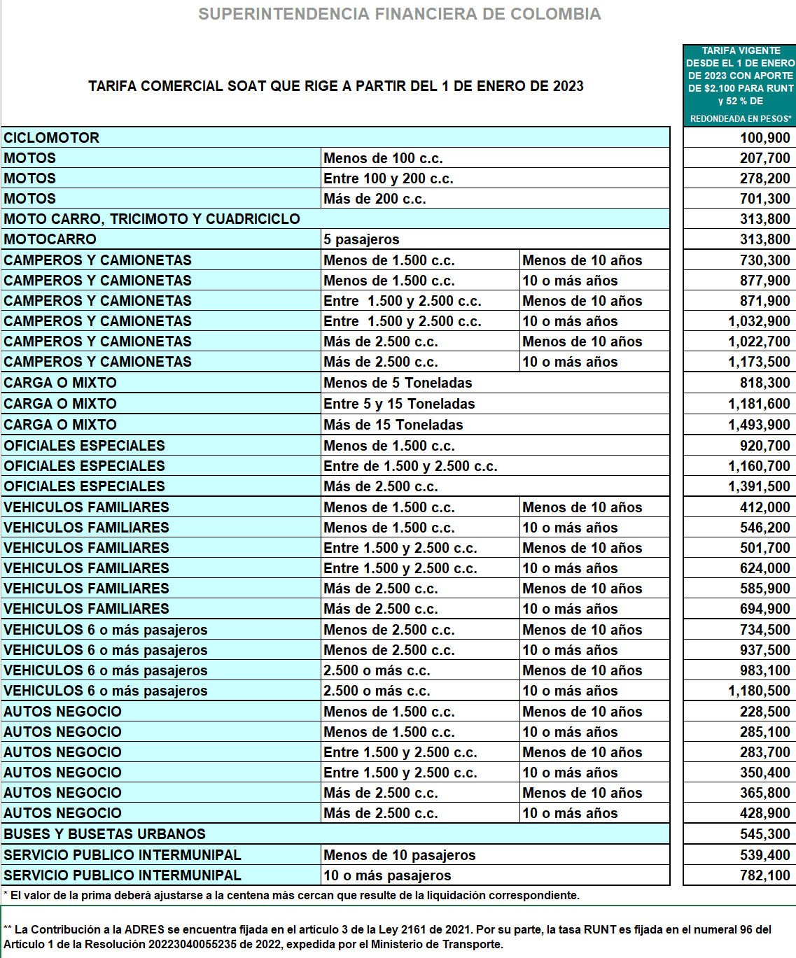 Colombia’s financial superintendency has released the new rate structure for Colombia’s compulsory vehicular bodily injury liability insurance (SOAT) for 2023. All registered vehicles using Colombian roads must carry this liability insurance coverage that pays for physical harm or death due to vehicular accidents in the country. SOAT covers drivers, passengers, and pedestrians, and is underwritten by private insurance companies.