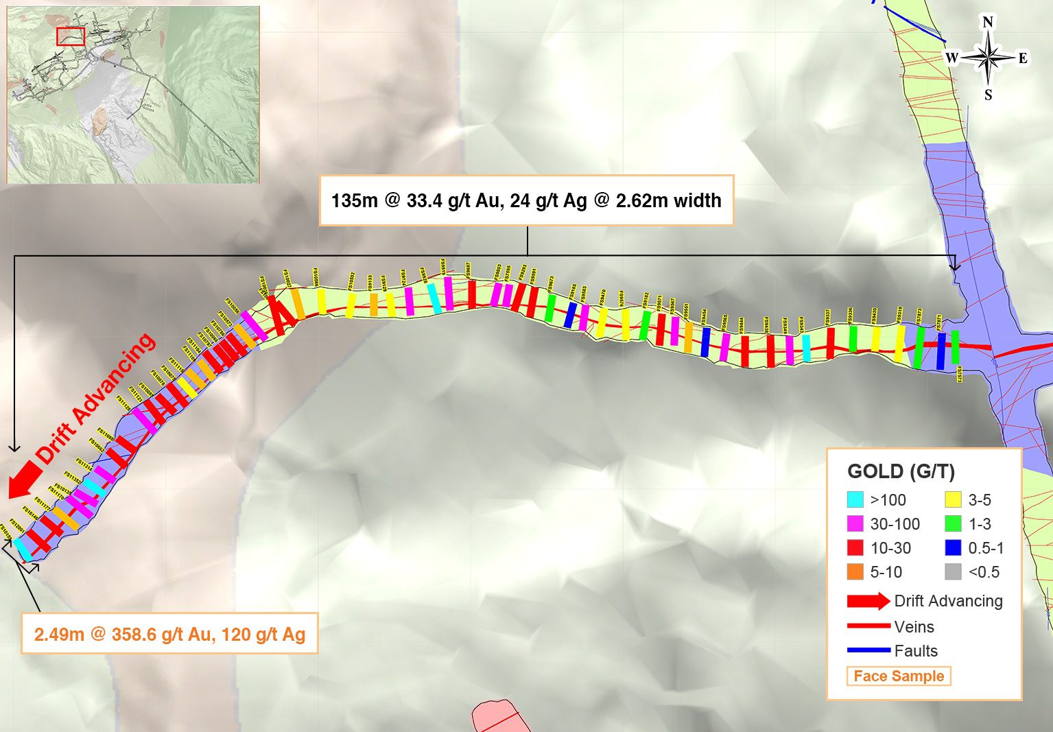 - 50 meters @ 60.9 g/t gold and 42 g/t silver at 2.64 meters width in the western side of the drift from the cross-cut.