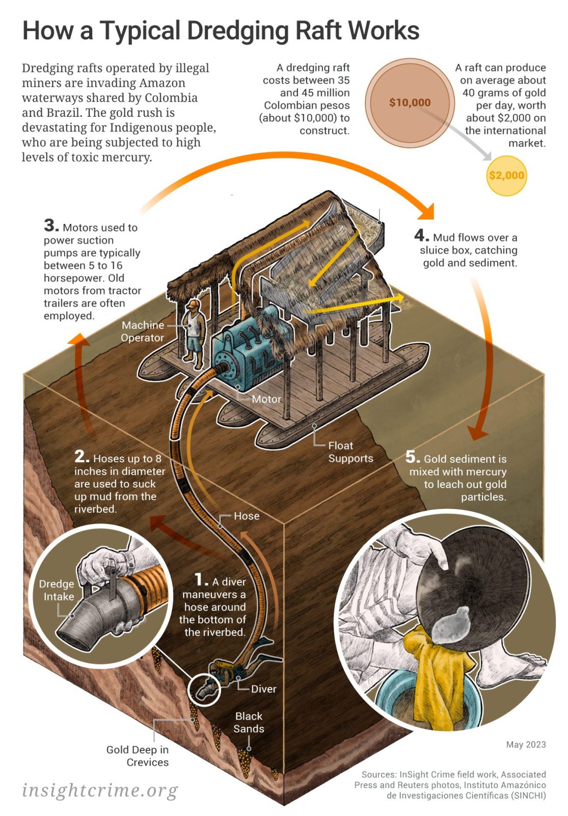 Colombians are involved as well. For example, a 2020 interdiction of ten dredging rafts on the Puré river led to the arrest of three people, two Brazilian nationals and a Colombian.