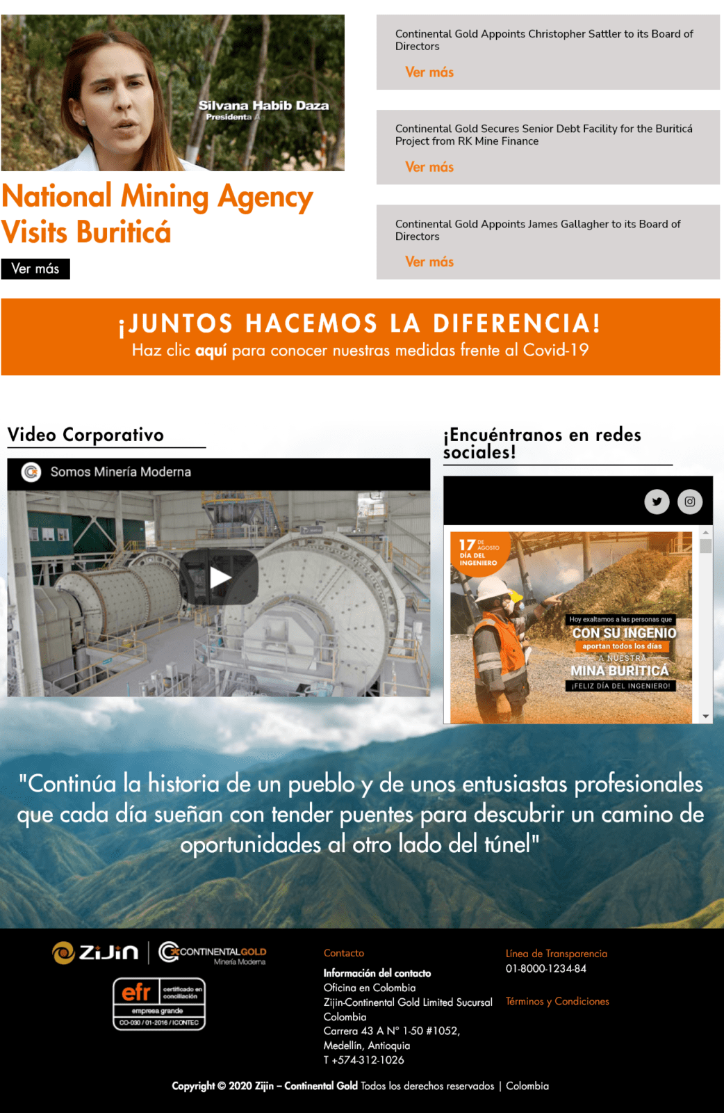 Zijin executives seem to be highly media-shy and prefer not to engage with the public. Visiting continentalgold.com features on the home page content 2017 highlighting a video from a visit of Silvana Habib Daza, who headed Colombia’s National Mining Agency two presidential administrations ago! In other words, the site has apparently been untouched since Zijin took control.
