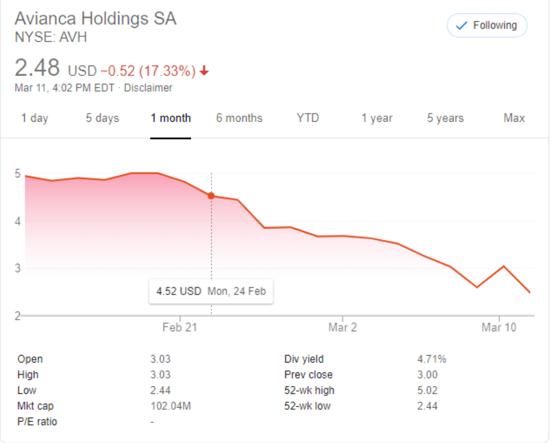 Colombian airline Avianca (NYSE: AVH), facing trouble on multiple fronts with scandals and operational issues, is down by more than half, to $2.44 at today’s close compared to $5.00 on February 20. The price fell over 17% the last day alone.