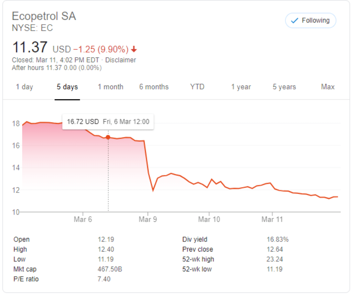 On March 9 when Saudi Arabia initiated a petroleum trade war with Russia, prices fell 30% after crude prices fell over the weekend by over 60%, from $51.99 to $34.71 USD (OPEC basket). This destroyed expectations by the Colombian government for dividends it was planning to receive from Ecopetrol. The petroleum company will now find it challenging to maintain positive margin between production costs and crude pricing.