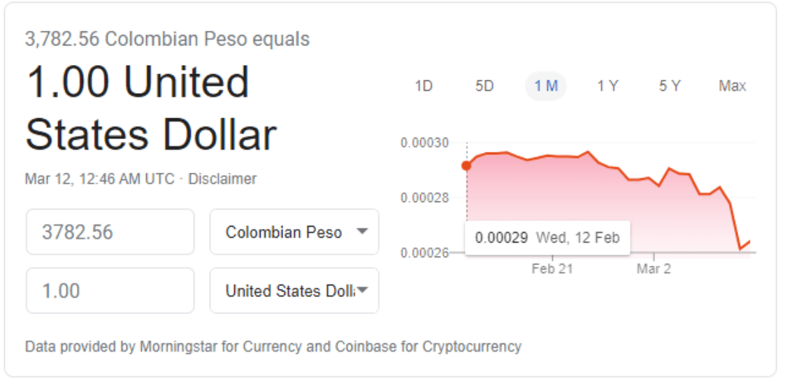 Today, one Colombian peso is only worth 0.026 US cents, so the smallest denomination Colombian coin, a 50 peso piece, is worth 1.3 US cents. The peso has also fallen off a cliff, going from under 3,400 pesos per dollar to over 3,800 pesos per dollar this week—record levels.
