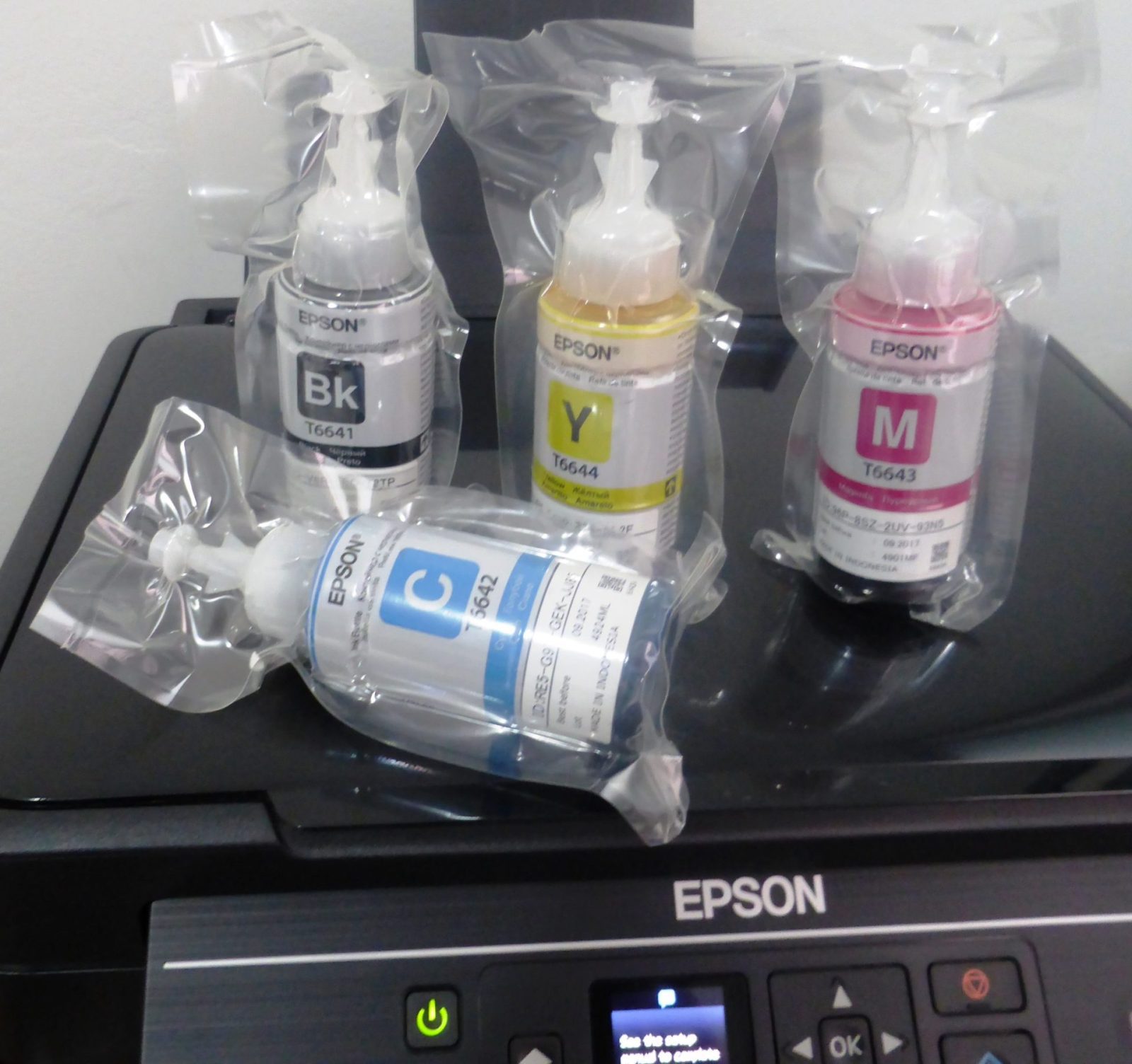 There are four ink bottles in the package. According to Epson, these should provide up to 20 times the capacity as a set of ink cartridges; up to 4000 black pages, and up to 6,500 color pages. Printing this much purchasing standard cartridges could cost up to $800, so the new Ecotank system offers significant savings on TCO (Total Cost of Ownership). According to an advertising circular for Office Depot in Medellin for August, 2015, the refill bottles are on sale for $28,800 COP, or under $10 USD each, thanks to Colombia’s weak peso. The same flyer lists the Epson Ecotank Inkjet Printer at a sale price of $524,250 COP ($170.49 USD as of 30 August) reflecting a 25% discount off the normal price of $699,000 COP ($227.32 USD).