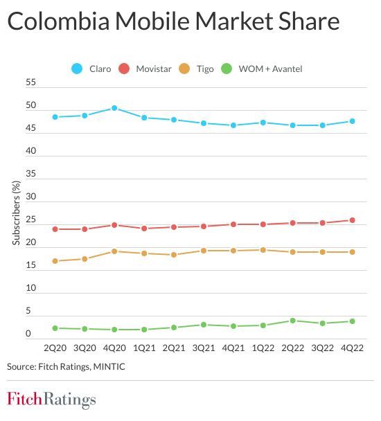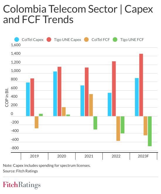 A weak consumer environment, mobile market saturation, pricing pressure, high interest rates and elevated investment spending needs will pressure credit profiles for select Colombia telecom companies, Fitch Ratings says. Defending market share and generating sufficient FCF (Free Cash Flow) to maintain conservative leverage profiles will be key rating factors for incumbent operators. The current operating environment will constrain financial flexibility and could pressure ratings for Colombia Telecomunicaciones (ColTel) and UNE EPM Telecomunicaciones (Tigo UNE).