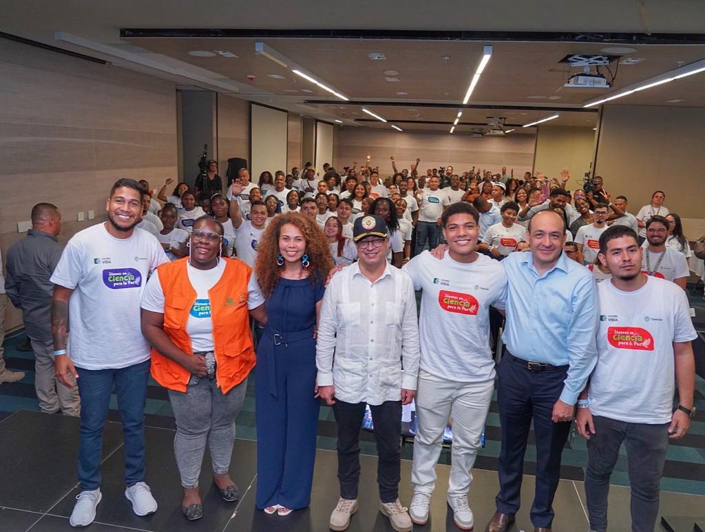 Photo: Science Minister Yesenia Olaya Requene and President Gustavo Petro (center) along with the Youth in Science for Peace program honorees. (Credit: Minciencias)