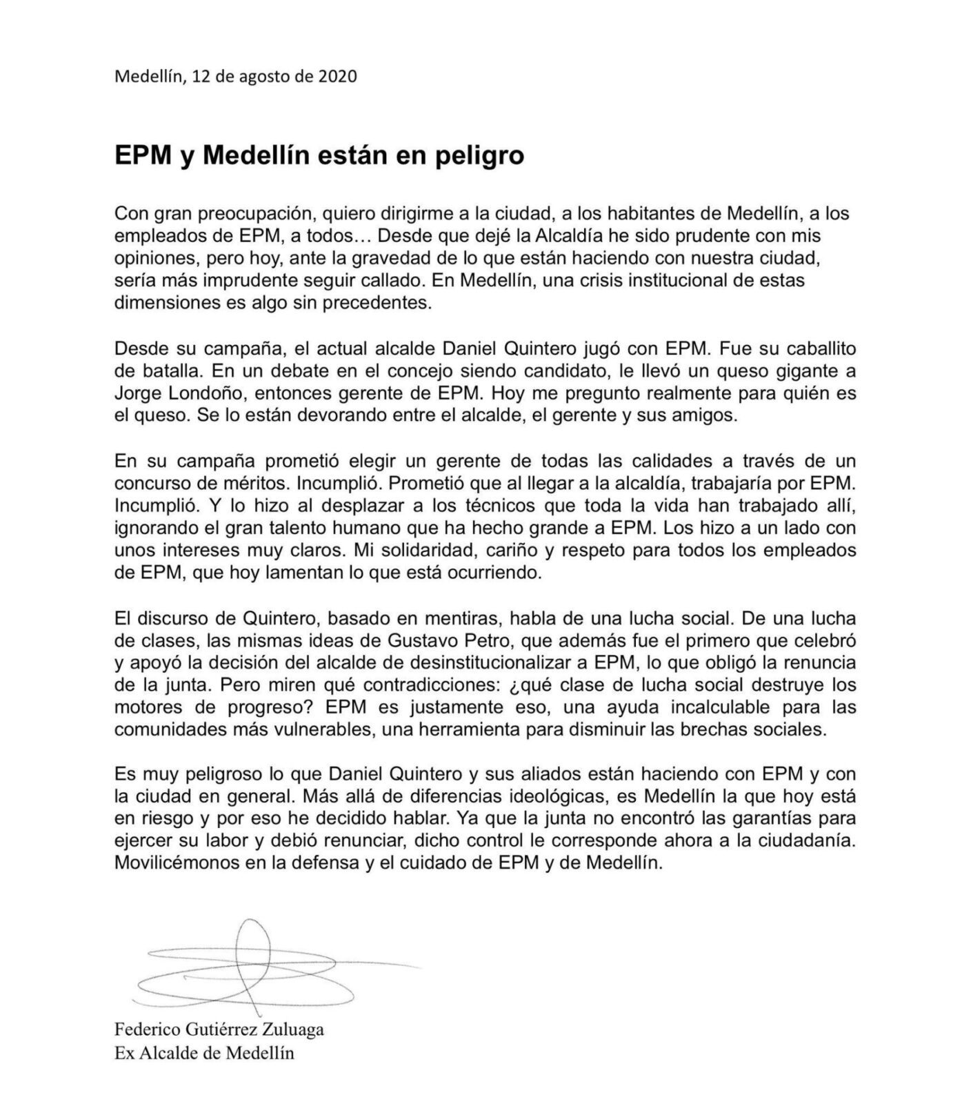 “The discourse of Quintero is based on lies. He talks of social struggle, of a class struggle, the same ideas of Gustavo Petro, who furthermore was the first to celebrate and support the mayor’s decision to deinstitutionalize EPM, which obliged the board’s renunciation. But look at the contradictions: What kind of social struggle destroys the motors of progress? EPM is that very thing, an incalculable help for the most vulnerable communities, a tool to breach social divides.” – excerpt from Federico Gutierrez’s letter.