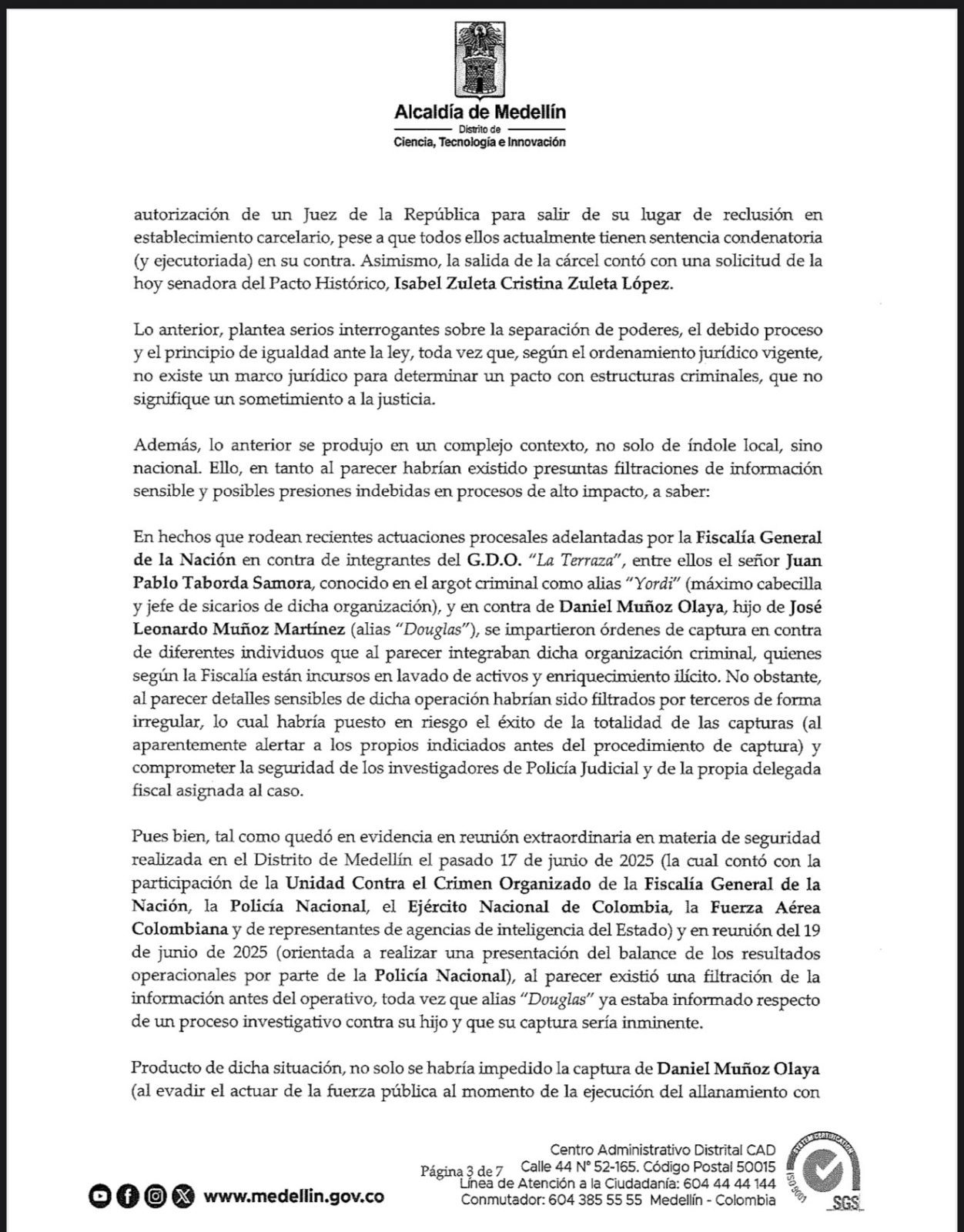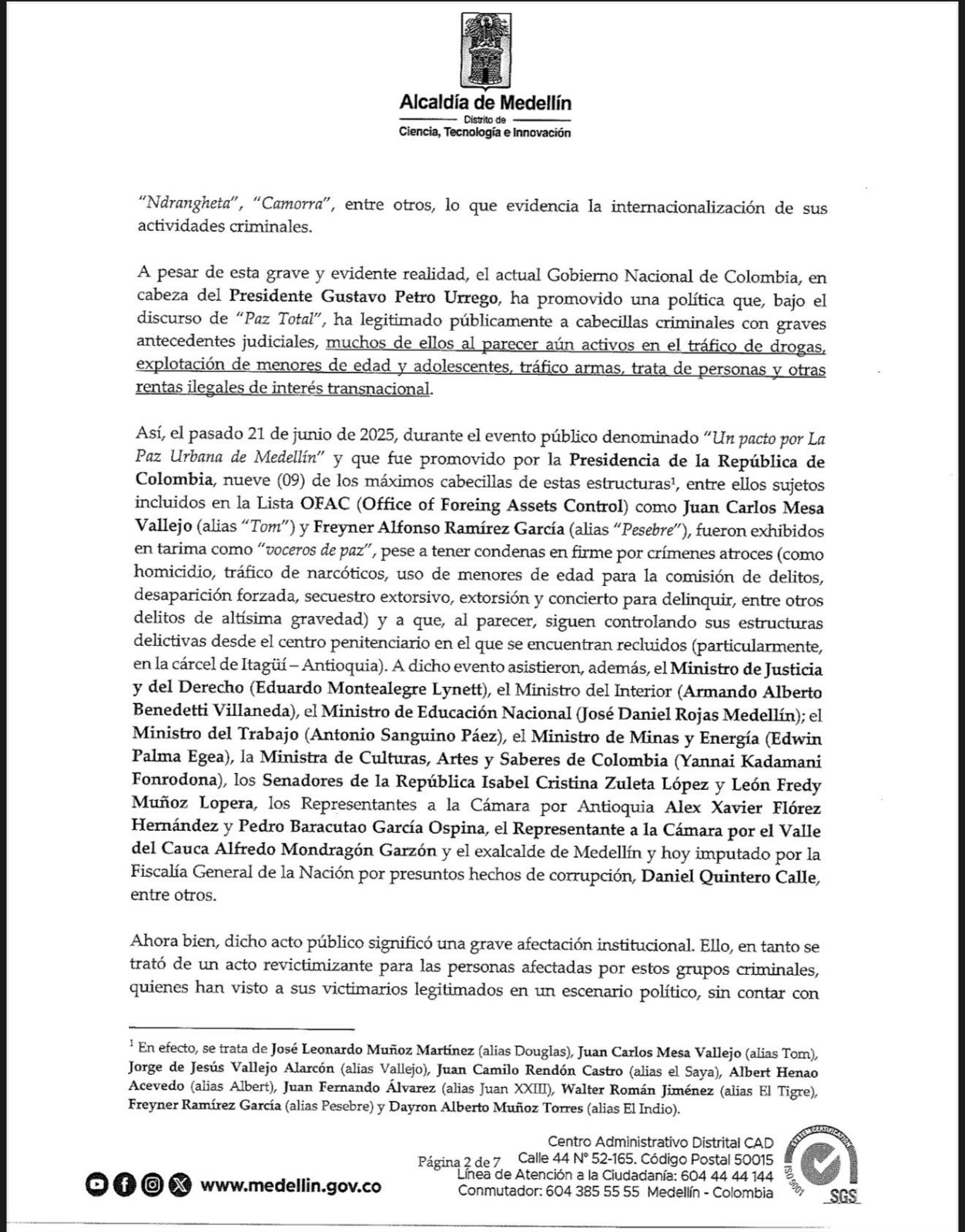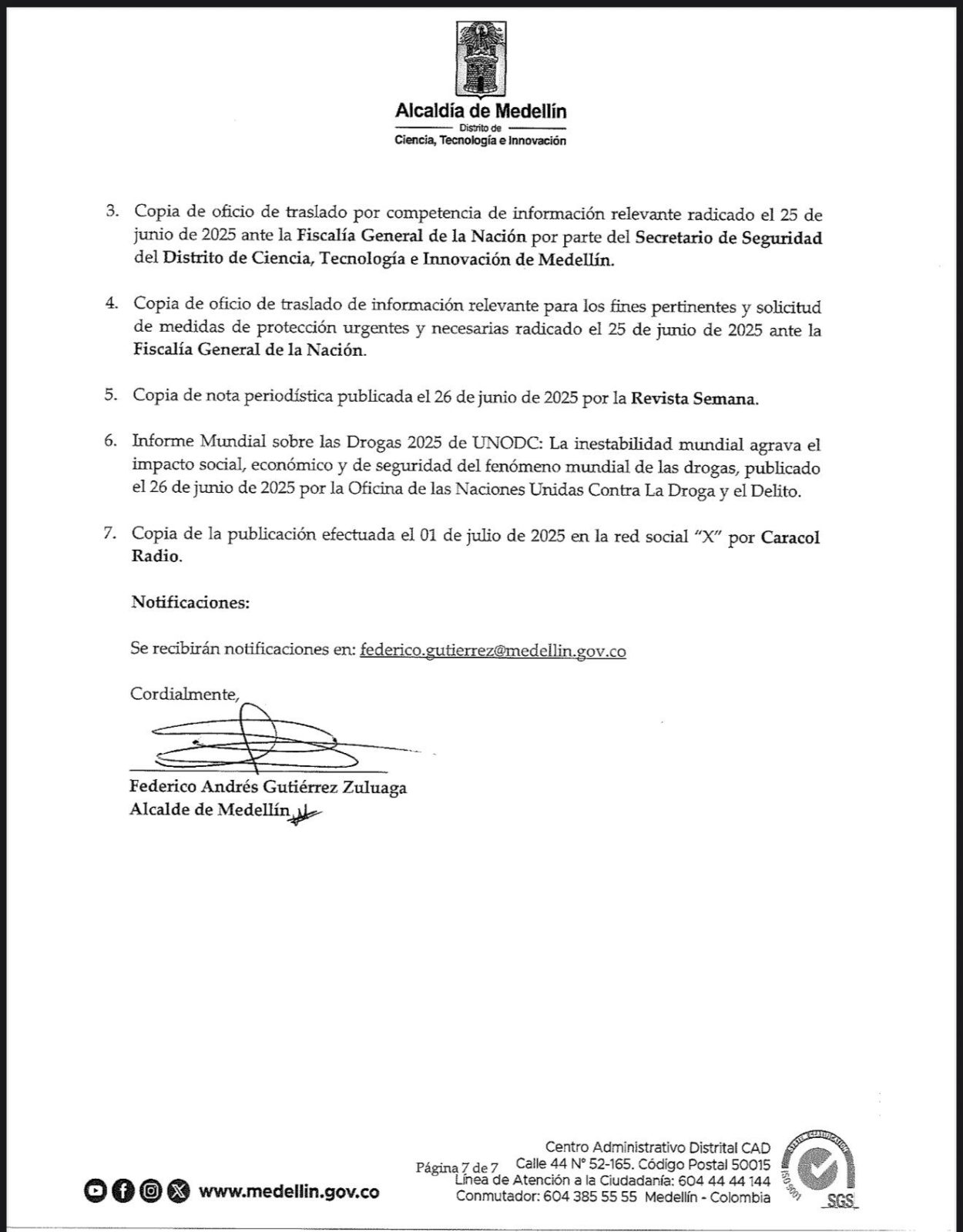 I, Federico Gutiérrez Zuluaga, in my capacity as Mayor of the Special District of Science, Technology, and Innovation of Medellín, identified with NIT 890.905.211-1, respectfully address you to express profound institutional concern over recent events that, stemming from the national policy of the current Colombian Government, are allegedly favoring, directly and indirectly, criminal structures that have historically affected the security of both our city and that of its international allies, among them, the United States of America.