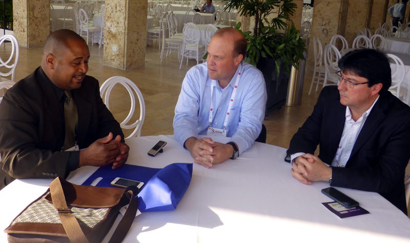 Photo: Loren Moss of Finance Colombia (left) speaks with Eric Crabtree (center) and Carlos Ferrer (right) of Unisys during the Asobancaria 2017 conference in Colombia. (Credit: Loren Moss)
