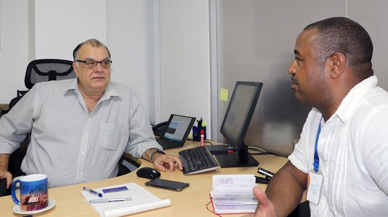 Guillermo Peña Bernal, vice president at Sociedad Portuaria Regional de Barranquilla, and Loren Moss of Finance Colombia speak in Barranquilla. (Credit: Loren Moss)