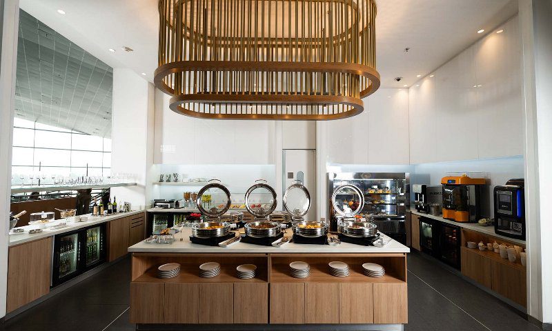 Approximately 70% of the seating and furnishings were updated for improved comfort, including the co-working areas, via a materials reutilization process. The facility also incorporated new motion-sensor faucets and other materials with a low environmental impact. A metallic structure lamp, weighing an estimated 400 kilograms, was installed over the buffet area, positioning the space as a central feature of the lounge. The redesign provided an unobstructed view of the runway for departing passengers.