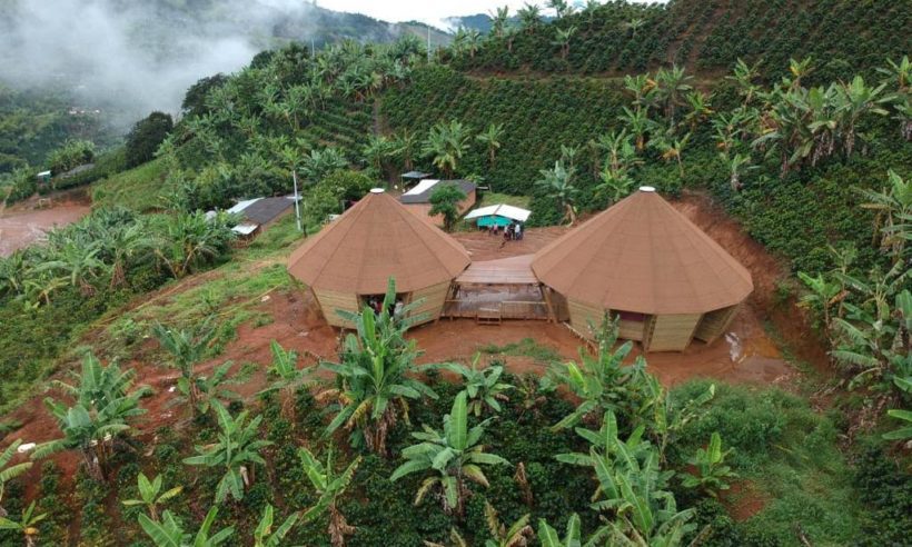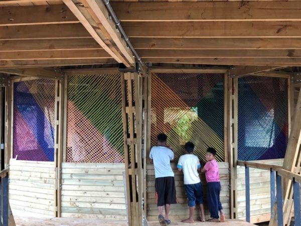 The Ricardo González indigenous rural school, delivered February 14, is composed of three circular wooden tambo-type modules. Of these, two are equipped for multi-functional classrooms and one for the kitchen, dining room and bathrooms for children. Traditions, customs, symbols and beliefs of the indigenous ethnic group were incorporated into its construction.