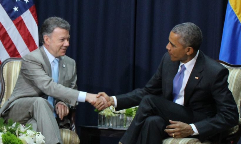 ABOVE: Colombian President Juan Manuel Santos shakes hands with United States President Barack Obama during a cordial bilateral meeting that they held while the two leaders were attending the Summit of The Americas in Panamá last week. Also attending were Colombian Foreign Minister Maria Angela Holguin, and United States Secretary of State John Kerry. Topics discussed were the United States’ support for the Colombian peace process, and for Colombia’s possible accession to the OECD.