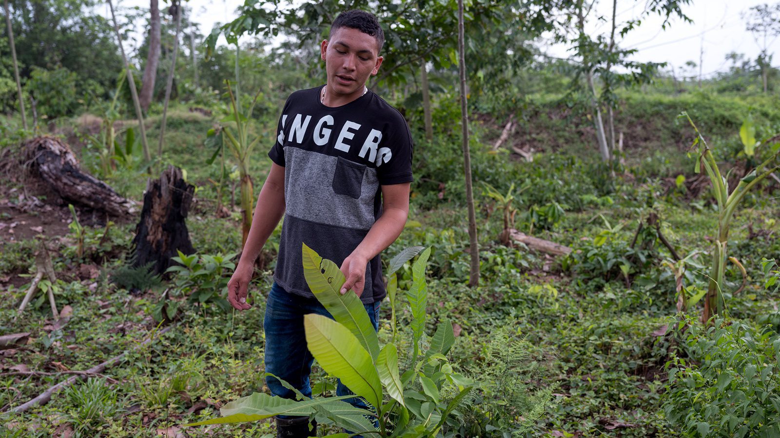 Photo: Ramón gives a tour of the land that his family owns, showing the diversity of flora that has been taken over by palm oil plantations. (Photo credit: Thom Pierce | Guardian | Global Witness | UN Environment)