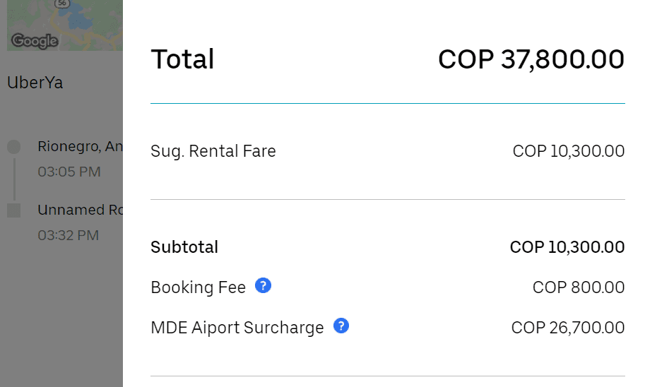 To test these complaints, Finance Colombia booked an Über trip to and from Rionegro, Colombia to the San Vicente Hospital complex, a large healthcare facility a few minutes from—but not connected to—the nearby international airport. Sure enough, there were airport surcharges, and no way to remove them.