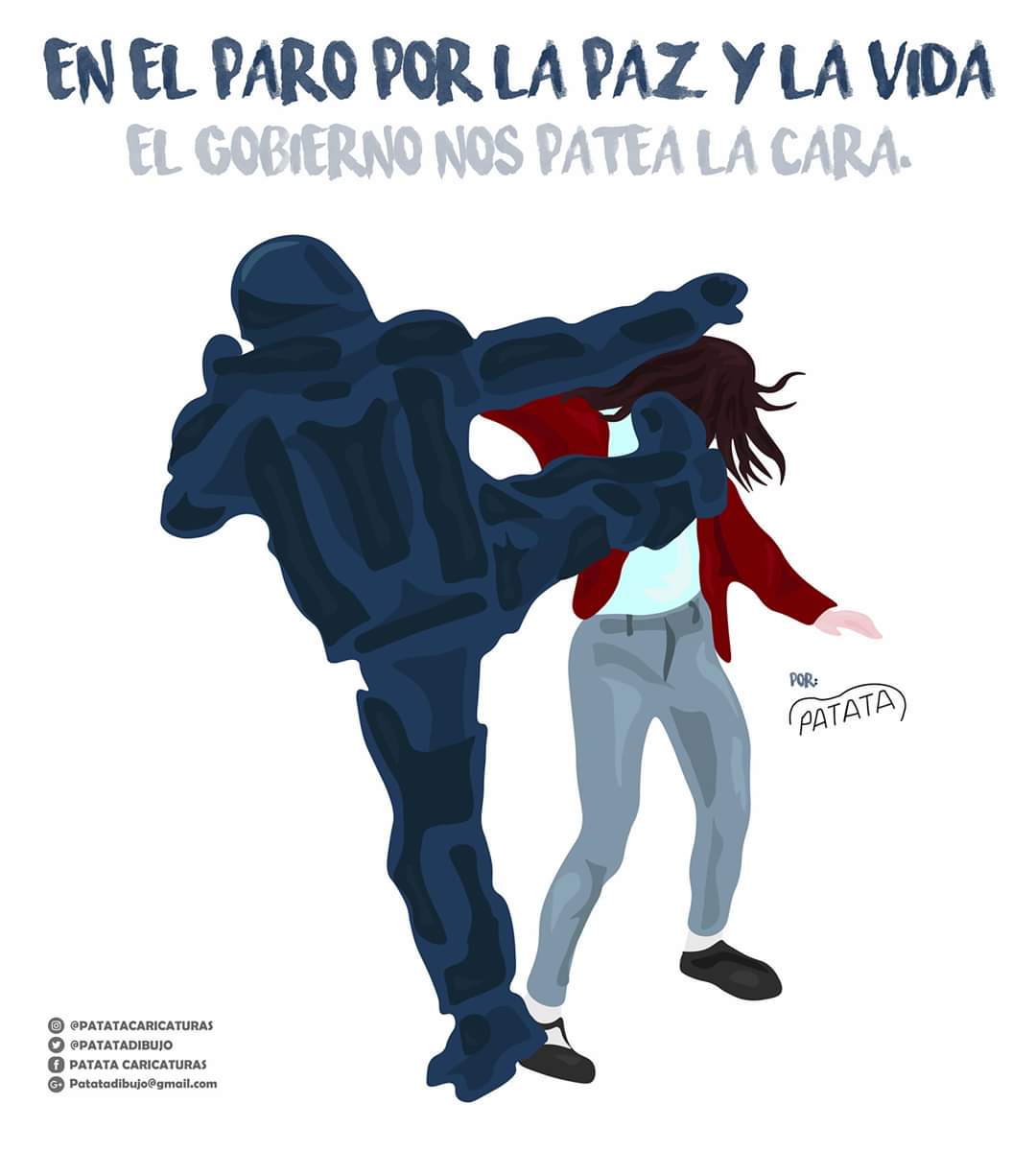 Below: “In the strike for peace and life, the government kicks us in the face”- by @patatadibujo on Twitter. Used with permission.