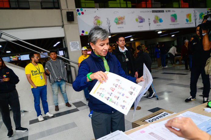 Above photo: Claudia López, candidate in the centrist primary, casting her vote in Bogotá. Photo courtesy of Claudia López’s campaign team.