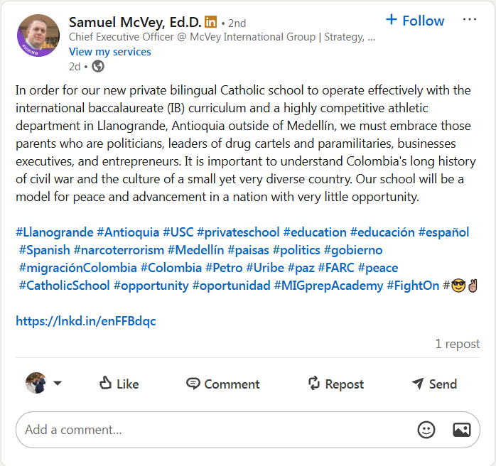 On LinkedIn, McVey claims to have a new private school in Llanogrande, Antioquia, that embraces “leaders of drug cartels and paramilitaries” among others.