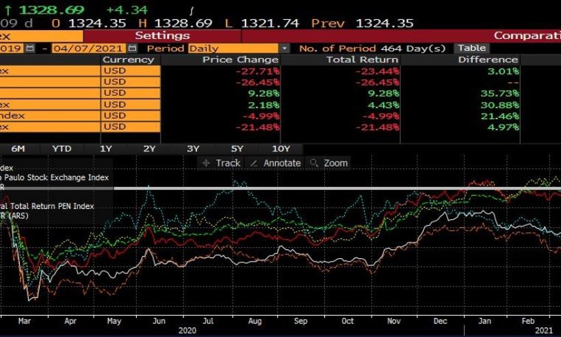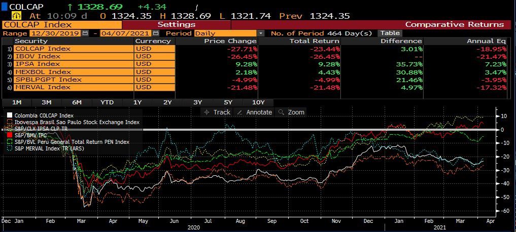 Above (courtesy of our chums at Bloomberg) we find a basic chart, in dollars, of what has happened among the Latam indices since COVID made its way into our lives. Put simply, Colombia has been the worst performer, only marginally versus a couple of cases but versus the rest, it is miles behind.
